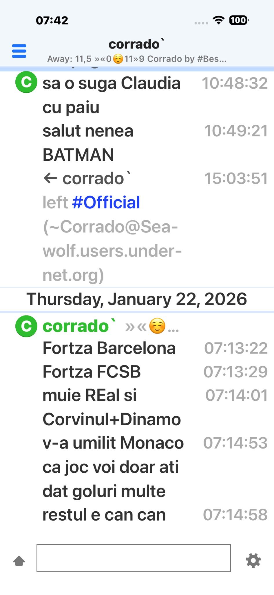 | corrado n-a fost foarte cuminte si a fost dat afara de 11 ori! De exemplu: *** Corrado` was kicked by X ((Alexy) ieși) DonNadie a primit doar 5 kick-uri. |